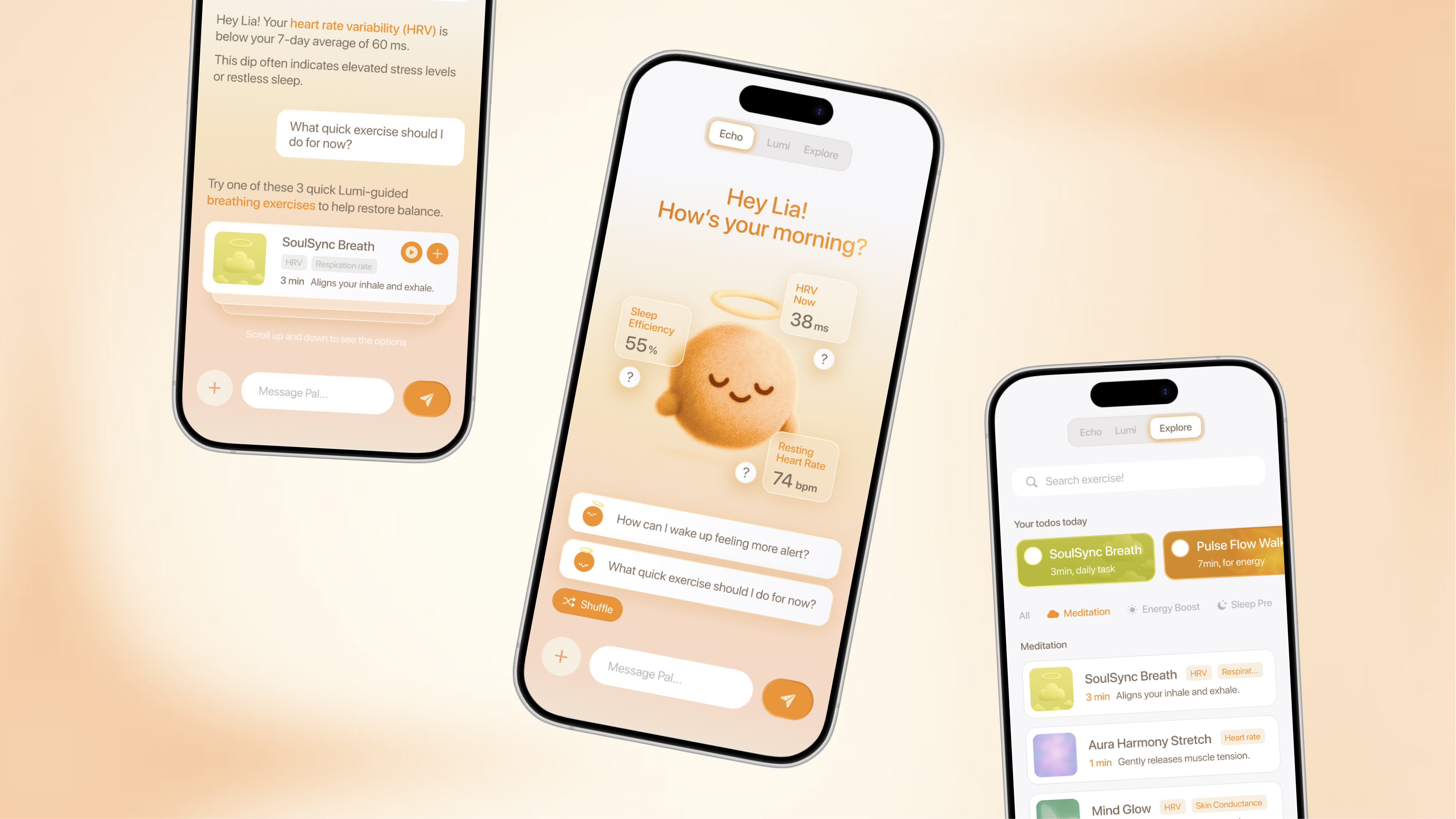 Led product and UX design for an AI-powered companion app, featuring a dynamic IP character that translates physiological data into personalized insights and habit-building coaching.